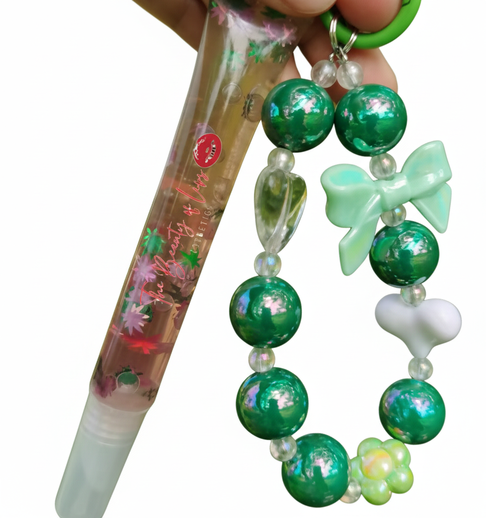 A clear, super-sweet lip gloss with floating floral leaves and a cute green charm keychain perfect for all ages glossy, girly, and perfect for everyday shine.